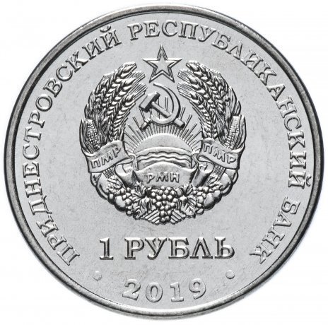 Аверс: в центре находится изображение Государственного герба Приднестровской Молдавской Республики, ниже указан номинал - «1 РУБЛЬ». Вдоль края расположены надписи, разделенные точками: «ПРИДНЕСТРОВСКИЙ РЕСПУБЛИКАНСКИЙ БАНК», «2019».