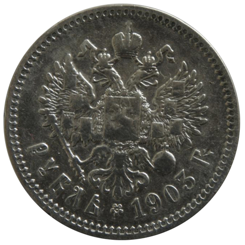 Аверс: в середине Малый Государственный Герб Российской империи, под ним вдоль края монеты слева номинал «РУБЛЬ», в середине цветочная розетка, справа выпуска монеты «1903 Г.».