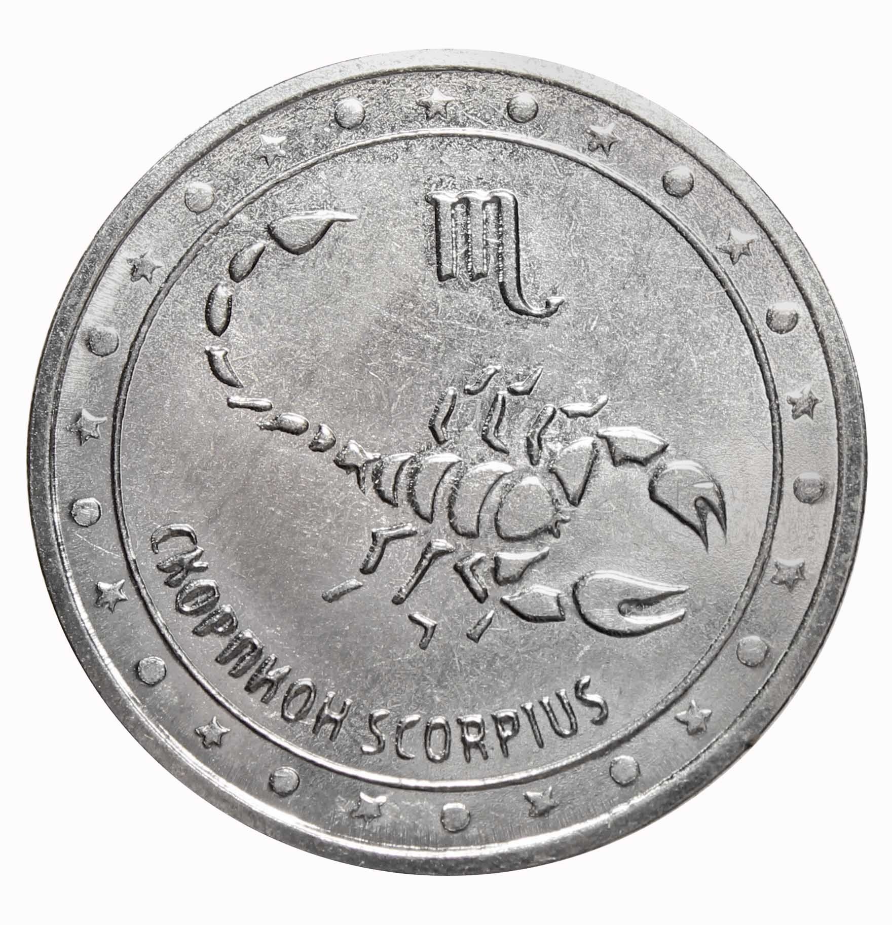 На оборотной стороне: в центре – стилизованное изображение знака зодиака «Скорпион», в нижней части монеты – по кругу надпись «СКОРПИОН Scorpius»