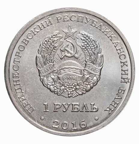 На лицевой стороне: в центре – изображение государственного герба Приднестровской Молдавской Республики, под ним номинал «1 РУБЛЬ». По кругу – надписи: вверху «ПРИДНЕСТРОВСКИЙ РЕСПУБЛИКАНСКИЙ БАНК», внизу – год выпуска монеты «2016»