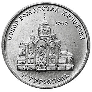 Реверс: в центре находится изображение собора Рождества Христова. Над ним написано - «2000». Вдоль края монеты полукругом размещены надписи: вверху - «СОБОР РОЖДЕСТВА ХРИСТОВА», внизу – «г. ТИРАСПОЛЬ».