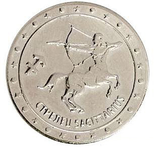 Реверс: изображено стилизованное изображение знака зодиака «Стрелец» и надпись «Стрелец Sagittarius».