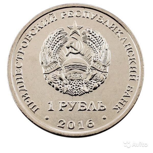 Аверс: изображен государственный герб ПМР, надпись «Приднестровский республиканский банк», год выпуска «2016», и номинал «1 рубль».