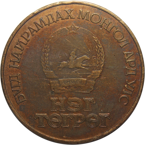 1 тугрик. 50 лет революции. Монголия. 1971 год. F-VF. Бронза