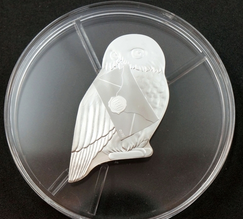 В 2021 году монетный двор Парижа отдал дань уважения этому важному литературному и кинематографическому произведению, отчеканив коллекцию монет и медалей, посвященную Гарри и волшебному миру. Эта монета оригинальной формы отдает дань уважения Хедвиг, сове, которую Хагрид подарил Гарри Поттеру на его 11-летие, купленную в Косом переулке. Хедвиг держит в клюве письмо о зачислении из школы чародейства и волшебства Хогвартс, полученное каждым волшебником в свой 11-й день рождения. На аверсе мы находим шрам Гарри Поттера в форме болта, знак Непростительного Заклинания, брошенного волшебником Волан-де-Мортом. На этой стороне выгравирован номинал монеты и аббревиатура RF.