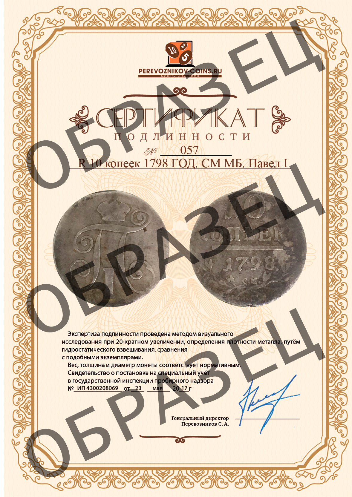 Реверс: по краю монеты зубчатый ободок, в середине вверху номинал «10», ниже надпись «КОПЕЕК», под ней горизонтальная прямая черта, ниже год выпуска монеты «1797». Внизу две сращенные ветви над ними буквы «СМ» (Санкт-Петербургская монета), под ними инициалы минцмейстера «МБ» (Михаил Бобровщиков).
