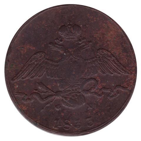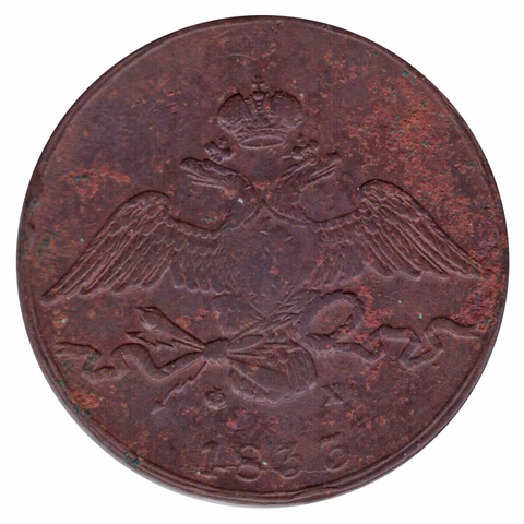 Аверс: В центре изображен Государственный Герб Российской империи - двуглавый орёл с распростёртыми и опущенными вниз крыльями. Над головами орла - императорская корона. На груди орла расположен Московский герб - щит с изображением Георгия Победоносца, поражающего копьем дракона. Орёл держит, перевитые орденской лентой ордена Св. Апостола Андрея Первозванного, громовые стрелы и факел в правой лапе и лавровый венок — в левой. Под лентой буквы: слева «Ф», справа «Х». Инициалы минцмейстера Федора Хвощинского. Под инициалами — дата выпуска монеты «1833.»