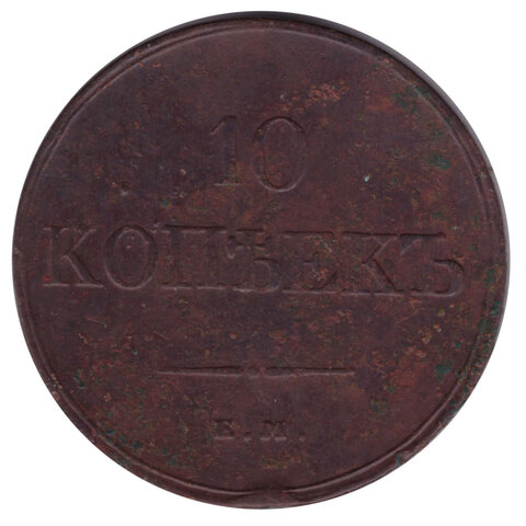 Реверс: В центре указан номинал «10». Под цифрой номинала — слово "КОПЕЕК". Ниже, расположен декоративный разделитель в виде двух разнонаправленных линий и небольшой точки между ними. Ниже, под разделителем — обозначение монетного двора «Е.М.».