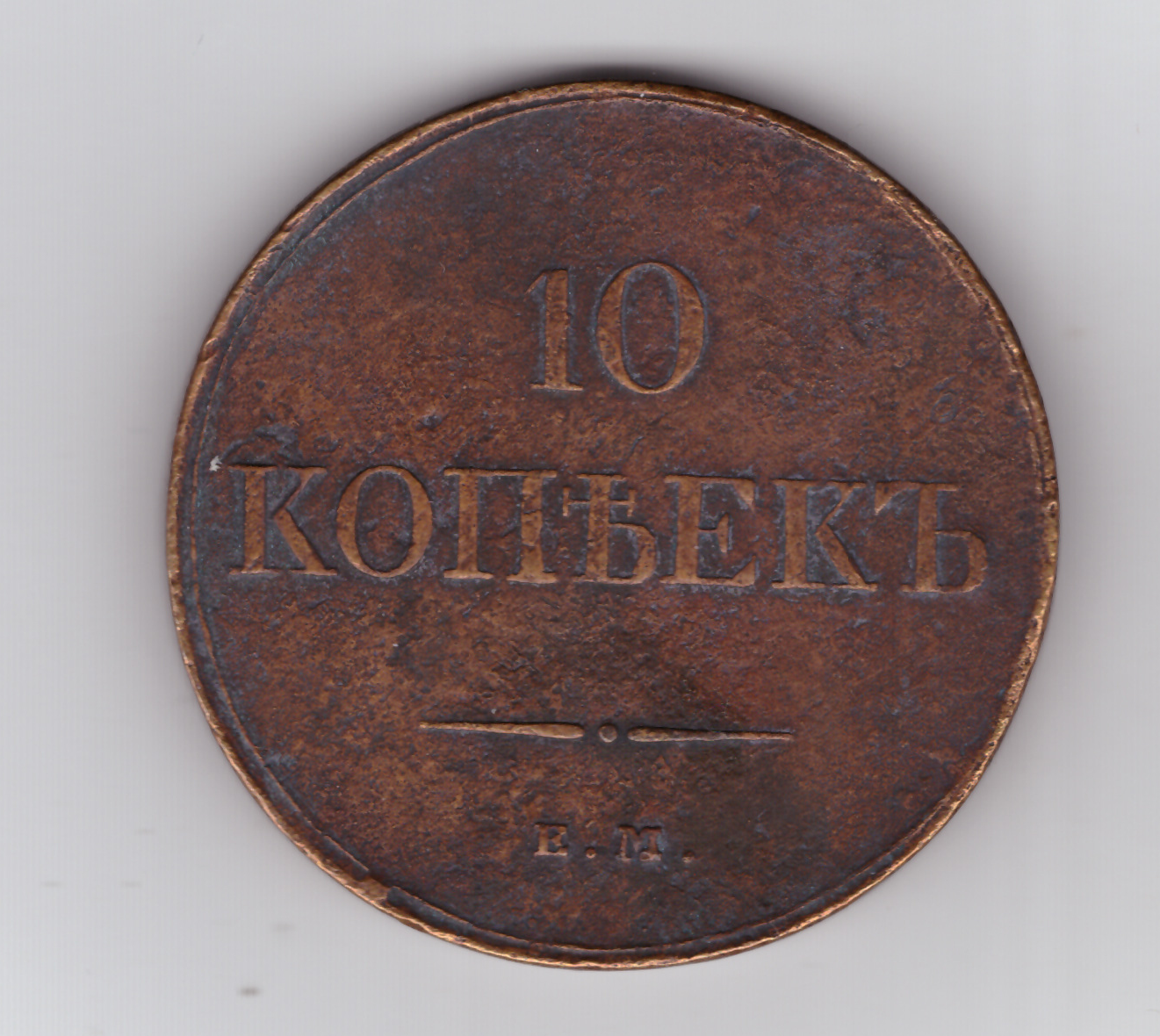 Реверс: В центре указан номинал «10». Под цифрой номинала — слово "КОПЕЕК". Ниже, расположен декоративный разделитель в виде двух разнонаправленных линий и небольшой точки между ними. Ниже, под разделителем — обозначение монетного двора «Е.М.».