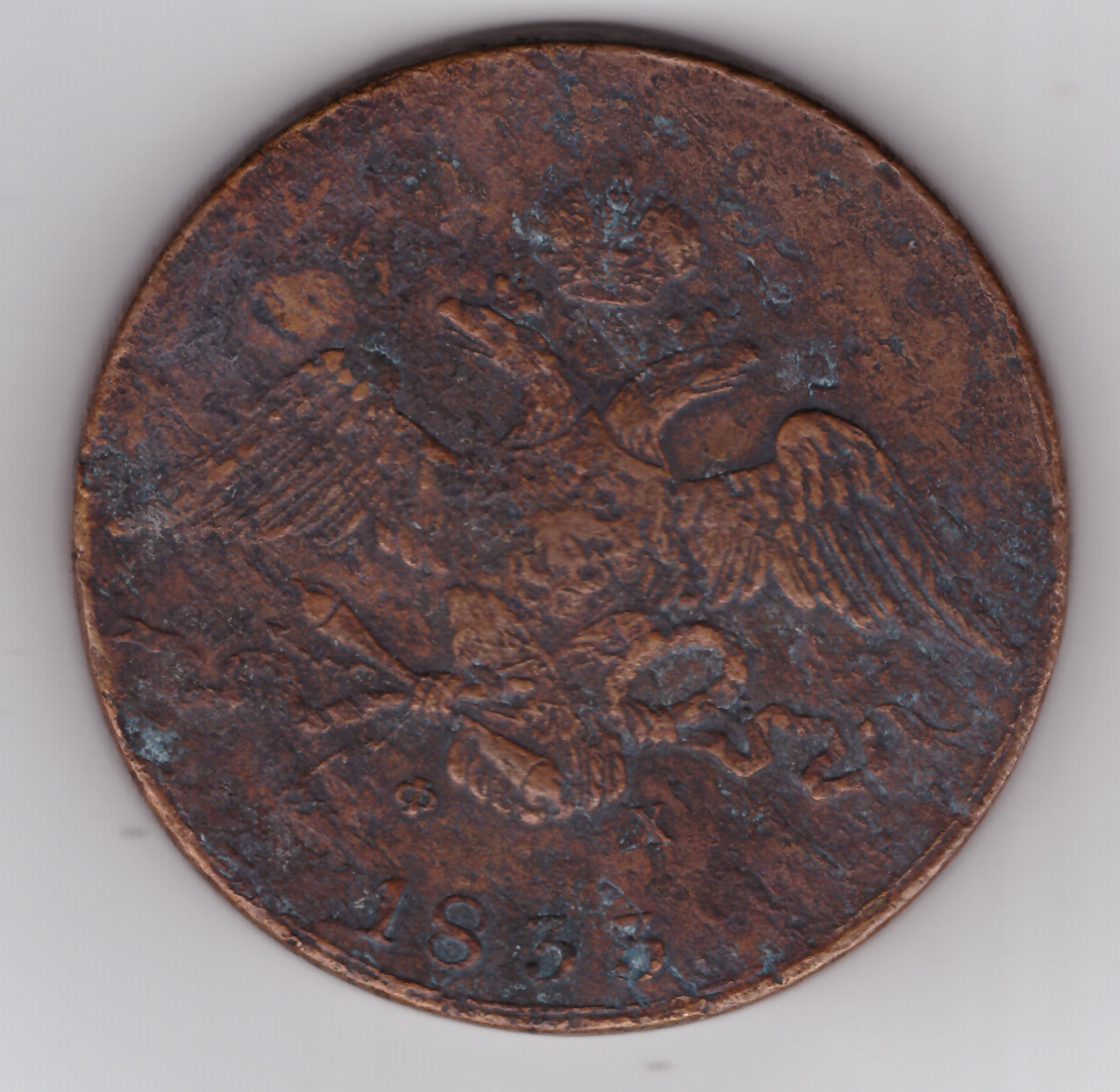 Аверс: В центре изображен Государственный Герб Российской империи - двуглавый орёл с распростёртыми и опущенными вниз крыльями. Над головами орла - императорская корона. На груди орла расположен Московский герб - щит с изображением Георгия Победоносца, поражающего копьем дракона. Орёл держит, перевитые орденской лентой ордена Св. Апостола Андрея Первозванного, громовые стрелы и факел в правой лапе и лавровый венок — в левой. Под лентой буквы: слева «Ф», справа «Х». Инициалы минцмейстера Федора Хвощинского. Под инициалами — дата выпуска монеты «1833.»