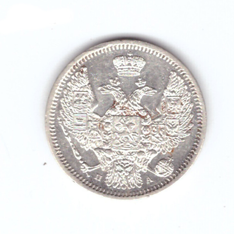 Реверс: В центре указан номинал «10». Над цифрой – Корона Российской империи. Под цифрой номинала — слово "КОПЕЕК". Ниже, расположен декоративный разделитель в виде двух разнонаправленных фигурных линий и небольшой выпуклой точки между ними. Под разделителем — дата выпуска монеты «1849». Под цифрой даты — обозначение монетного двора «С.П.Б.». Вдоль канта, не доходя до короны, изображен венок из лавровой и дубовой ветви, которые в нижней части перевязаны лентой на узел бантом. По окружности канта имеются рельефные элементы, выполненные в виде зубцов.