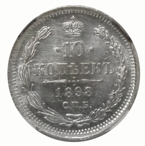 Реверс: слева вдоль края монеты лавровая ветвь, справа дубовая, внизу ветви соединяются и перевязаны лентой, в середине вверху Корона Российской империи, под ней обрамленный слева и справа звездочками номинал монеты - цифра «10», ниже слово «КОПЕЕК», под ним две направленные в разные стороны фигурные черты и ниже год выпуска монеты «1898», под ним обозначение монетного двора «СПБ».