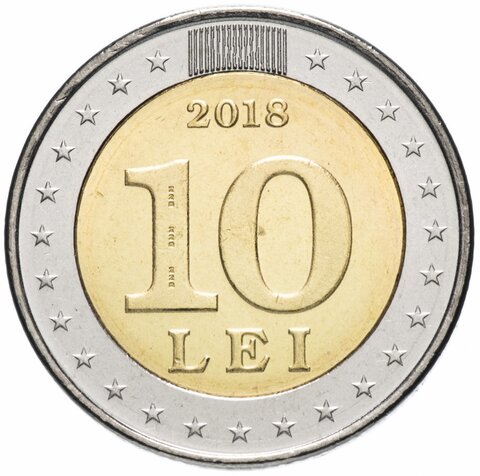 Реверс: В центре - номинальная стоимость «10 LEI» и год эмиссии «2018». В верхней части есть монограмма из букв «R» и «M» - сокращенное название «Республика Молдова», выполненная голографическим способом. По окружности отчеканено 25 звёзд, что символизирует количество лет со дня ввода национальной валюты в Молдове.