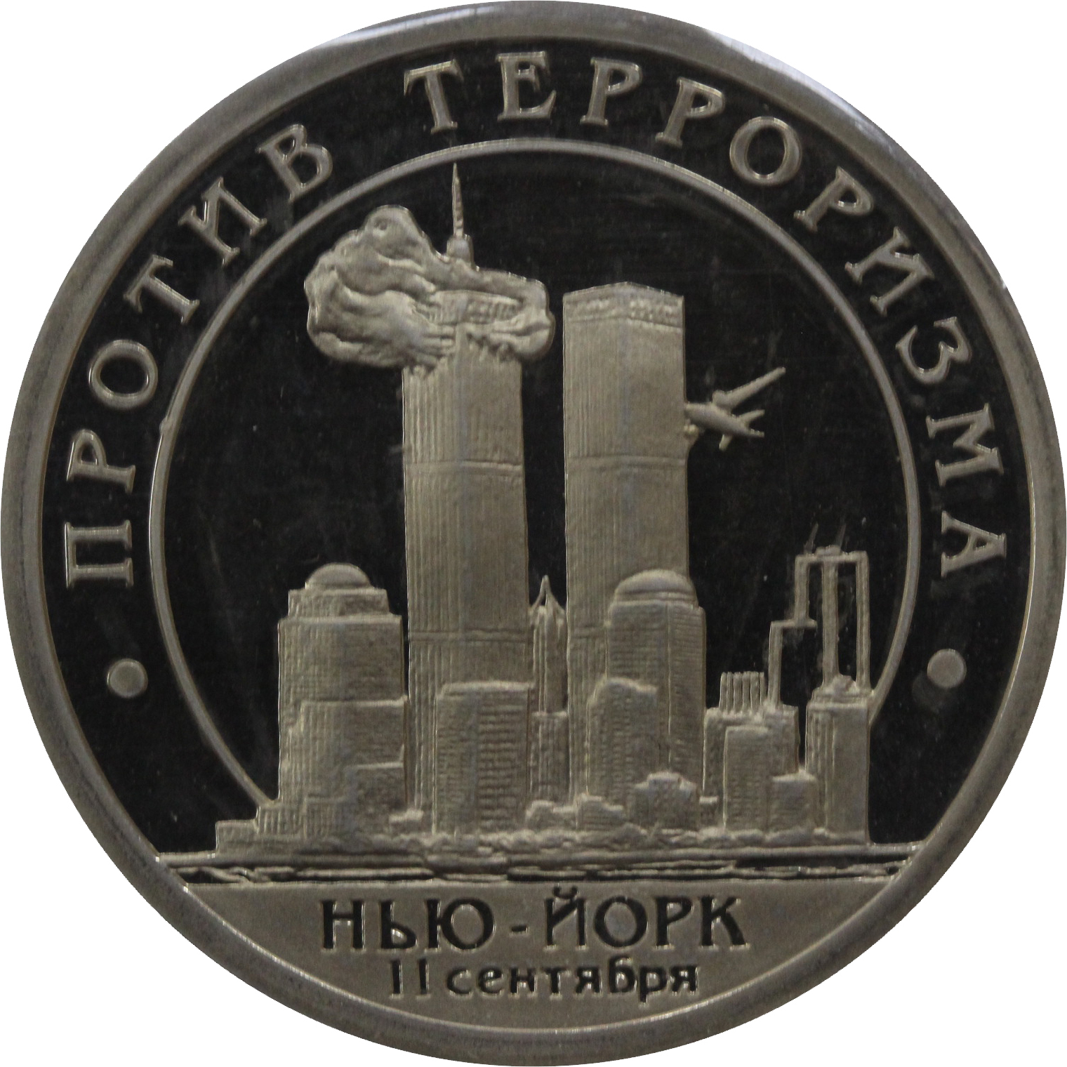 Реверс: изображена атака террористов на Башни-близнецы в Нью-Йорке с помощью гражданских самолётов, под ним вдавленными буквами в две строки дата и место события: "НЬЮ-ЙОРК 11 СЕНТЯБРЯ". Сверху изображение ограничено разомкнутым снизу кольцом, за которым вдоль канта надпись: "ПРОТИВ ТЕРРОРИЗМА" (в начале и конце имеется крупная точка).