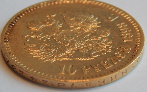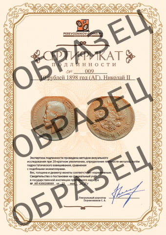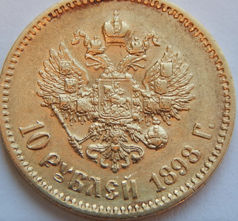 Аверс: в середине Малый Государственный Герб Российской империи, под ним вдоль края монеты номинал «10 РУБЛЕЙ» и год выпуска монеты «1898 Г.».