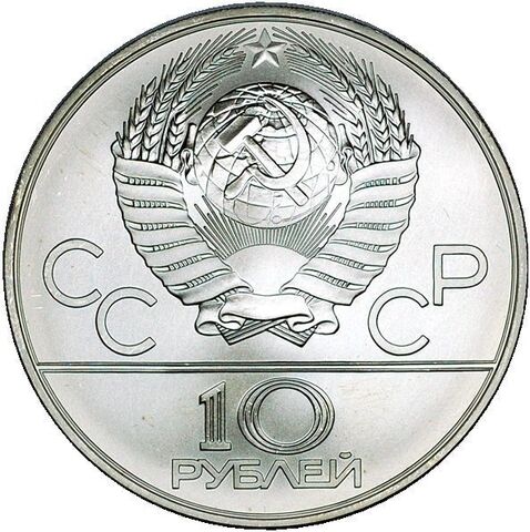 Аверс: сверху герб СССР с 15 витками ленты, слева от него буквы «СС», справа «СР», ниже двойная черта, под ней обозначение достоинства монеты цифра «10» и ниже слово «РУБЛЕЙ».