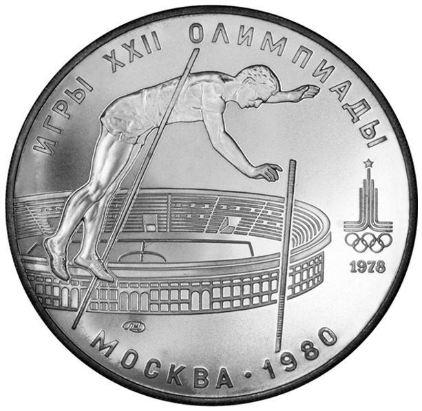 Реверс: сверху вдоль канта слова «ИГРЫ XXII ОЛИМПИАДЫ», ниже справа эмблема XXII Олимпийских игр и под ней год выпуска монеты «1978», в середине прыгун с шестом преодолевающий высоту, за ним стадион им. В.И. Ленина (Лужники), под стадионом монограмма монетного двора, внизу у края монеты разделенные точкой слово «МОСКВА» и год проведения XXII Олимпиады «1980».