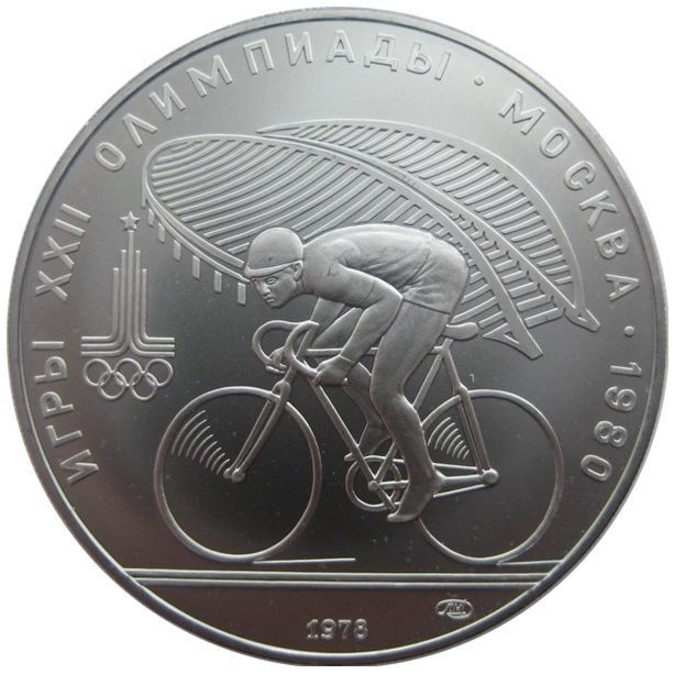 Реверс: слева и сверху вдоль канта слова «ИГРЫ XXII ОЛИМПИАДЫ», справа разделенные точкой слово «МОСКВА» и год проведения XXII Олимпиады «1980», слева эмблема XXII Олимпийских игр, в середине велосипедист, за ним велотрек в Крылатском, под велосипедистом справа монограмма монетного двора, внизу у канта год выпуска монеты «1978».