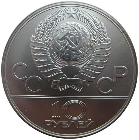 Аверс: сверху герб СССР с 15 витками ленты, слева от него буквы «СС», справа «СР», ниже двойная черта, под ней обозначение достоинства монеты цифра «10» и ниже слово «РУБЛЕЙ».
