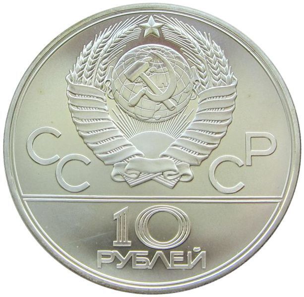 Аверс: сверху герб СССР с 15 витками ленты, слева от него буквы «СС», справа «СР», ниже двойная черта, под ней обозначение достоинства монеты цифра «10» и ниже слово «РУБЛЕЙ».