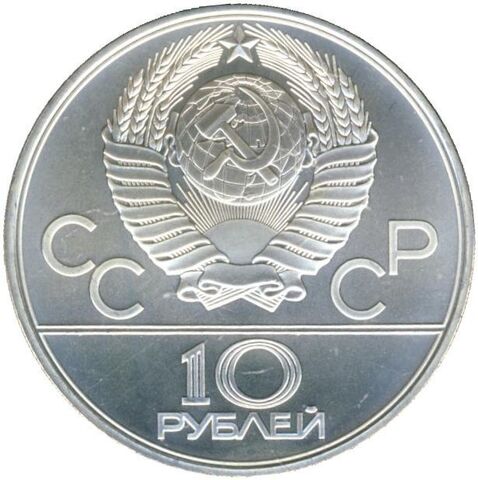 Аверс: сверху герб СССР с 15 витками ленты, слева от него буквы «СС», справа «СР», ниже двойная черта, под ней обозначение достоинства монеты цифра «10» и ниже слово «РУБЛЕЙ».