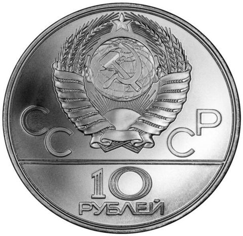 Аверс: сверху герб СССР с 15 витками ленты, слева от него буквы «СС», справа «СР», ниже двойная черта, под ней обозначение достоинства монеты цифра «10» и ниже слово «РУБЛЕЙ».