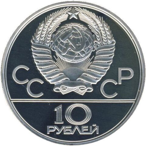 Аверс: сверху герб СССР с 15 витками ленты, слева от него буквы «СС», справа «СР», ниже двойная черта, под ней обозначение достоинства монеты цифра «10» и ниже слово «РУБЛЕЙ».