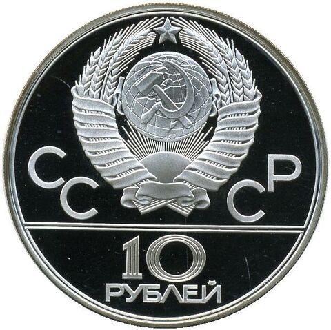 Аверс: сверху герб СССР с 15 витками ленты, слева от него буквы «СС», справа «СР», ниже двойная черта, под ней обозначение достоинства монеты цифра «10» и ниже слово «РУБЛЕЙ».