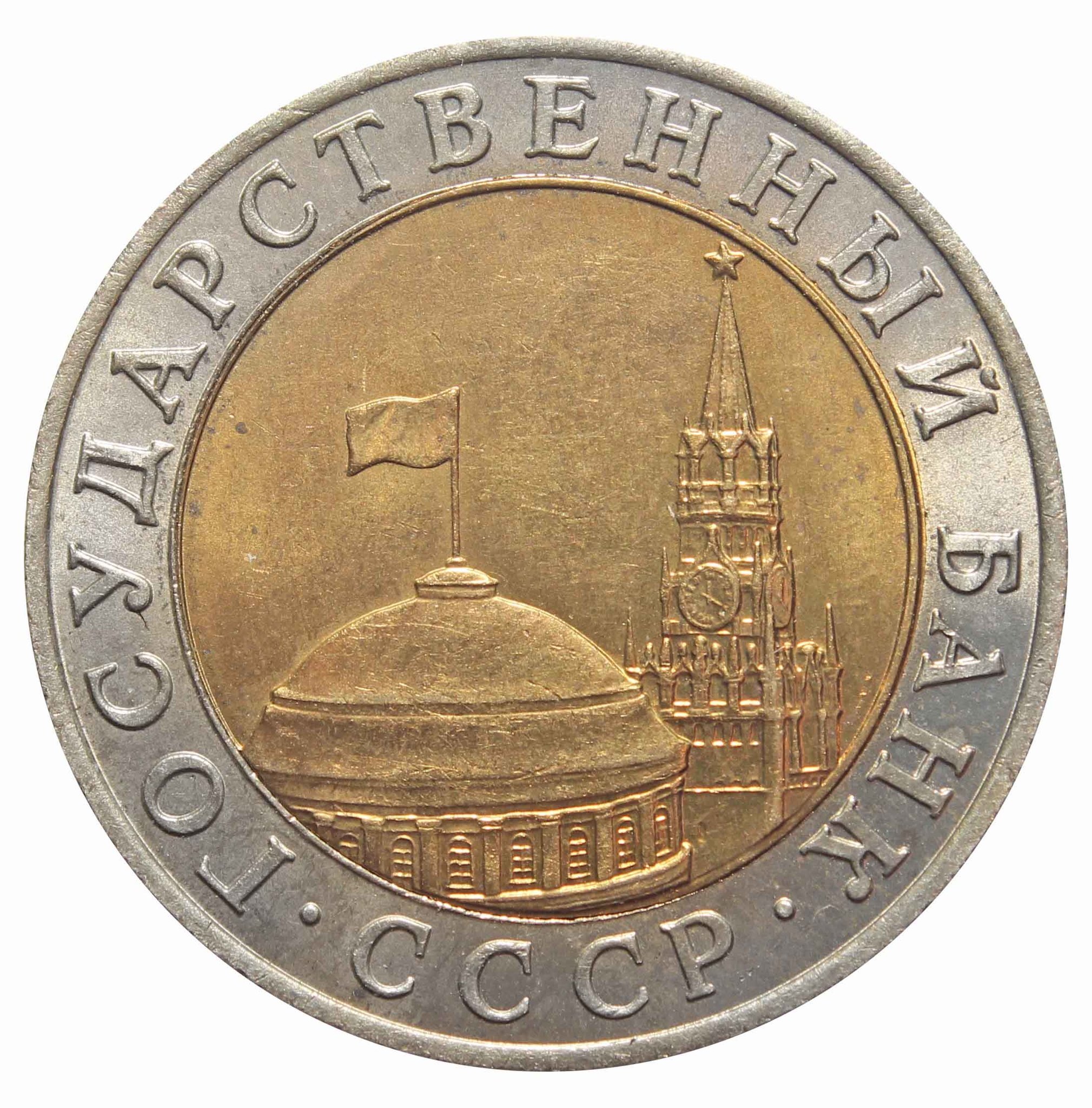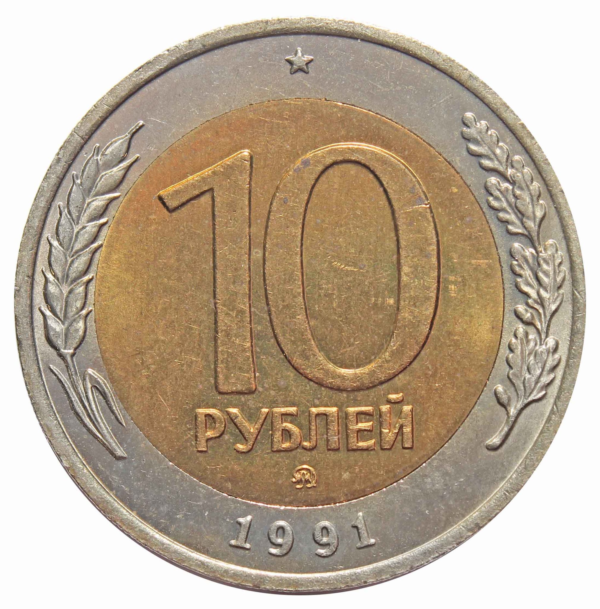 10 рублей, выпущенные в 1991 году, имели существенное внешние отличие от всех других раннее выпускавшихся монет СССР. Выполнены они были в биметаллическом варианте, из медно-никелевого (центральный диск) и медно-цинкового (обод) сплавов. Основной тираж был отчеканен на Ленинградском монетном дворе, одновременно производился чекан этой монеты и на ММД, но значительно меньшим тиражом.