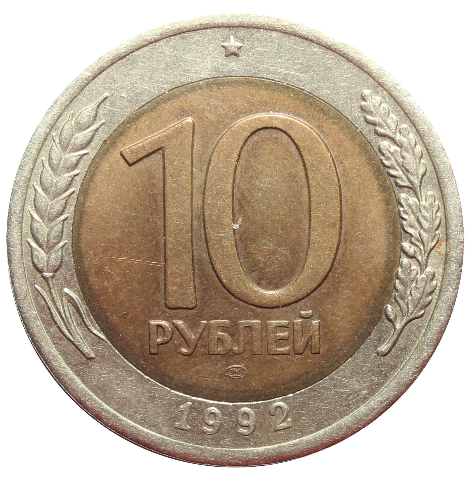 Реверс: В центре немного смещенная вверх цифра «10» обозначающая номинал монеты, ниже слово «РУБЛЕЙ», под ним монограмма монетного двора (ЛМД). Внизу у края монеты год выпуска «1992». Слева колос, справа дубовая ветвь.