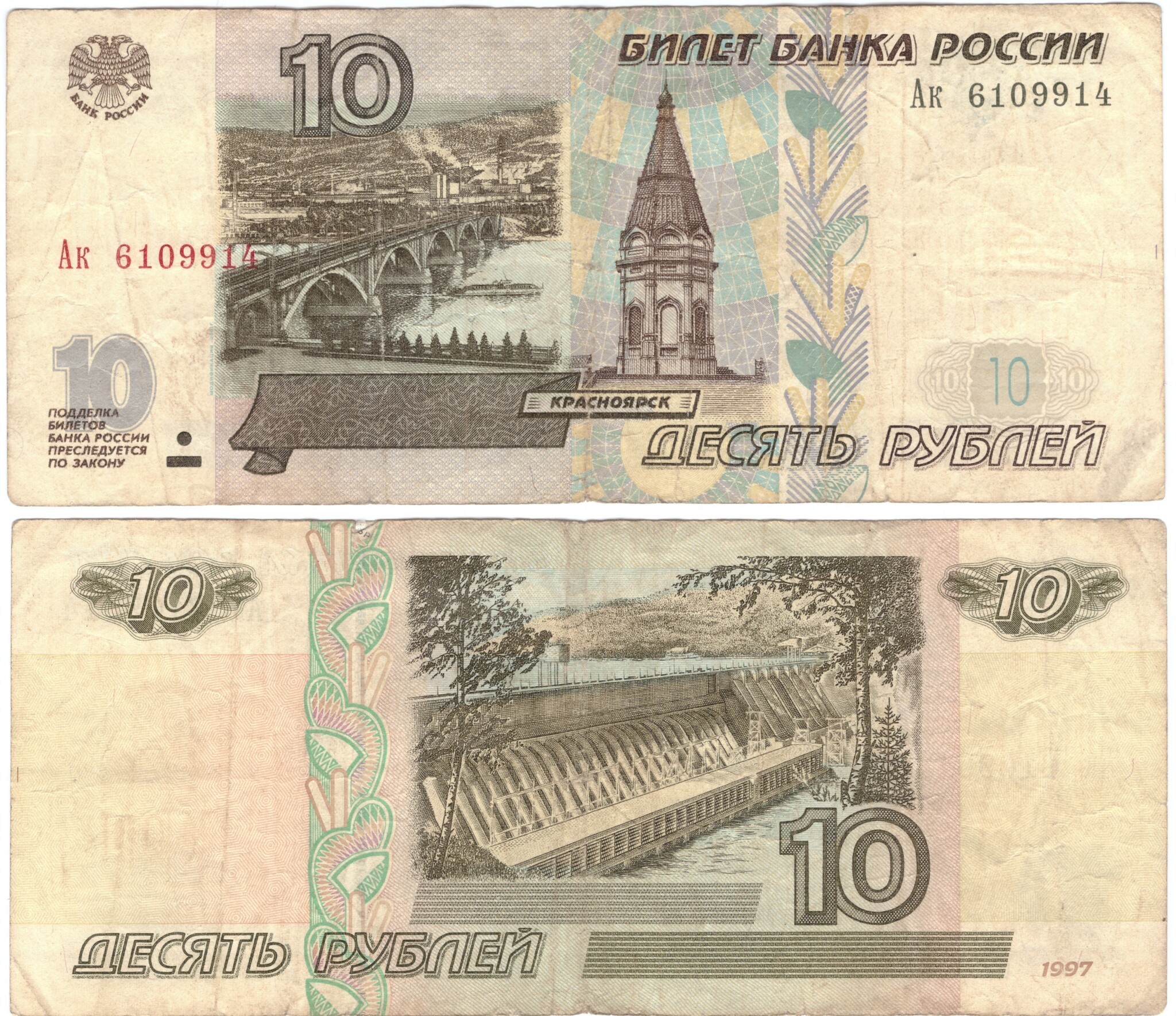 10 рублей 1997 год модификация 2001 год F