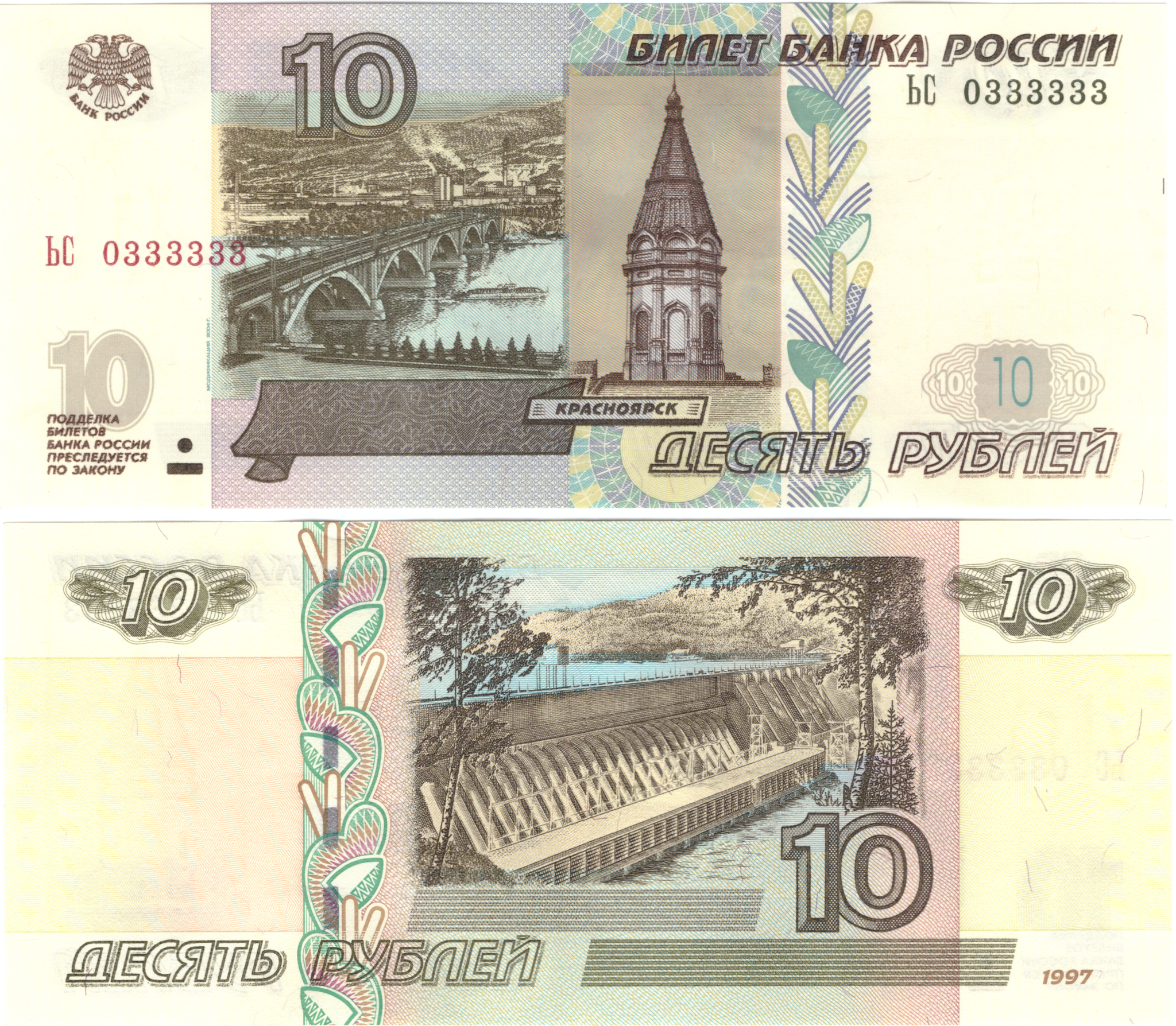 10 рублей 1997 Красивый номер ЬС 0333333 пресс UNC