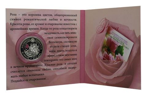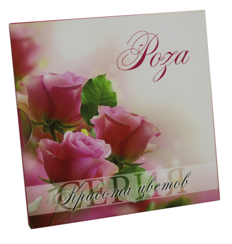 Реверс: в центре – на фоне рельефного стилизованного изображения цветка розы исполненное методом тампопечати изображение цветка розы; внизу надпись: ROSA.