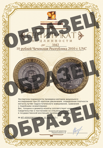 Монета выпущена в 2010 году Центральным Банком РФ. Чеченская Республика входит в состав России с 19 века (присоединилась после Кавказской войны). Долгое время была Чеченско-Ингушской автономной областью, пока в 1992 не разделилась на Чечню и Ингушетию. На реверсе изображен герб Чеченской Республики. ЧЯП