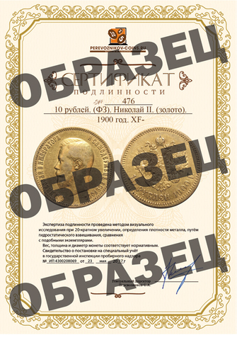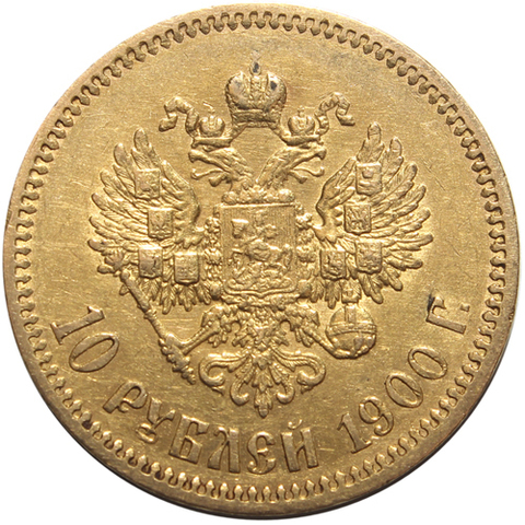 Аверс: в середине Малый Государственный Герб Российской империи, под ним вдоль края монеты номинал «10 РУБЛЕЙ» и год выпуска монеты «1900 Г.».