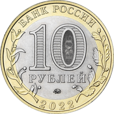 На лицевой стороне монеты на кольце по окружности расположены надписи: в верхней части — «БАНК РОССИИ», в нижней части — «2022». Слева и справа на внешнем кольце расположены изображения ветвей лавра и дуба соответственно, элементы изображения которых переходят на диск. В центре диска расположены число «10» и надпись «РУБЛЕЙ» под ним, обозначающие номинал монеты. Внутри цифры «0» имеется защитный элемент в виде числа «10» и надписи «РУБ», наблюдаемых под разными углами зрения к плоскости монеты. В нижней части диска расположен товарный знак Московского монетного двора.