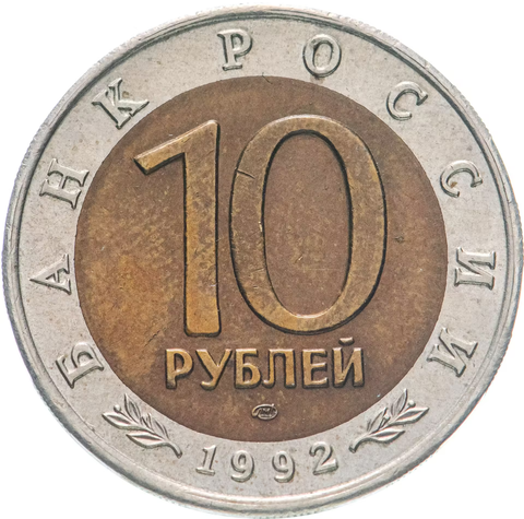 На аверсе монеты - номинал в две строки "10 РУБЛЕЙ", под ним - товарный знак монетного двора, на кольце вдоль канта по окружности - надписи, разделенные двумя фрагментами орнамента, вверху: "БАНК РОССИИ", внизу – год выпуска: "1992".