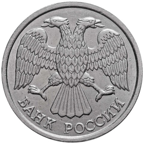 Аверс: в середине двуглавый орел с опущенными крыльями, перья без просечек, внизу надпись «БАНК РОССИИ».