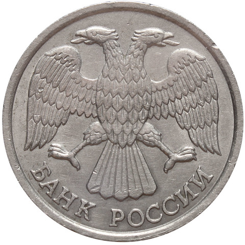 Аверс: в середине двуглавый орел с опущенными крыльями, перья без просечек, внизу надпись «БАНК РОССИИ».