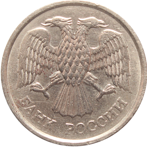 Аверс: в середине двуглавый орел с опущенными крыльями, перья без просечек, внизу надпись «БАНК РОССИИ».