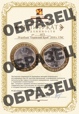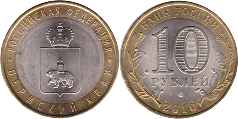 Монета выпущена в 2010 году Центральным Банком РФ. Пермский край начал свое существование в 2010 году после объединения Коми-Пермяцкого автономного округа и Пермской области. Край известен своими ресурсами. Леса занимают около семидесяти процентов суши. Также здесь добываются такие полезные ископаемые, как нефть, газ, алмазы и т.д. На реверсе изображен герб Пермского края. ЧЯП