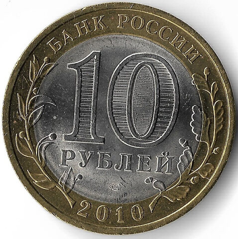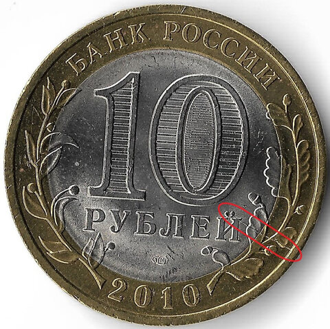 10 рублей ''Пермский край'' 2010 год, брак - раскол штемпеля (UNC)