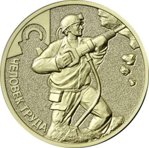 Реверс: рельефное изображение шахтера с буровым инструментом в руках и стилизованное изображение элемента шахтного подъемного механизма; слева по окружности имеется надпись: «ЧЕЛОВЕК ТРУДА».