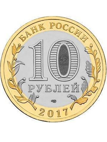 Аверс: на кольце по окружности расположены надписи: в верхней части — «Банк России», в нижней части – «2017». Слева и справа на внешнем кольце расположены изображения ветви лавра и дуба, соответственно, элементы изображения которых переходят на диск. В центре диска расположены число «10» и надпись «Рублей» под ним, обозначающие номинал монеты. Внутри цифры «0» имеется защитный элемент в виде числа «10» и надписи «Руб», наблюдаемых под разными углами зрения к плоскости монеты. В нижней части диска расположен товарный знак монетного двора.