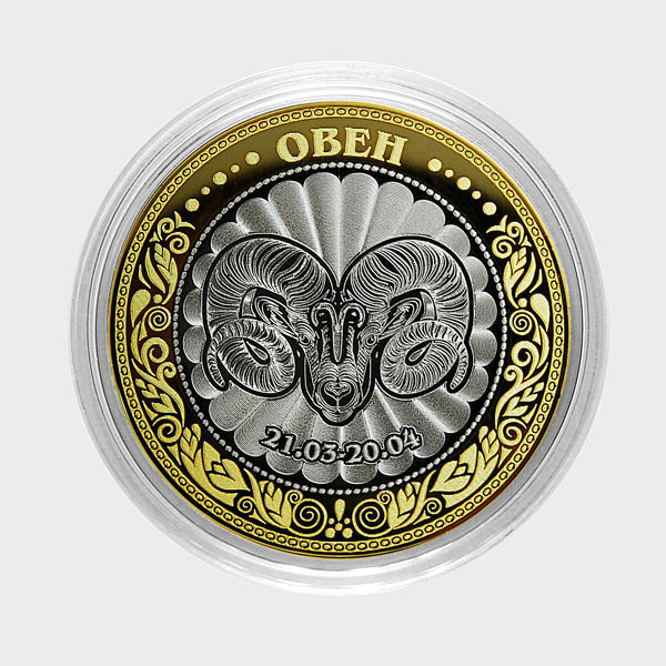 Сувенирная монета "Овен" номиналом 10 рублей с выгравированным изображением.