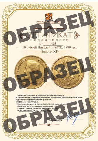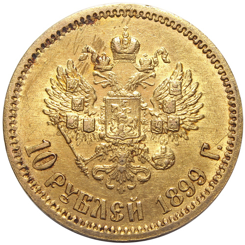 Аверс: в середине Малый Государственный Герб Российской империи, под ним вдоль края монеты номинал «10 РУБЛЕЙ» и год выпуска монеты «1899 г.».
