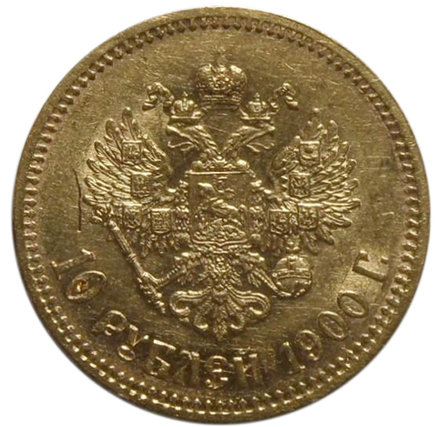 Аверс: в середине Малый Государственный Герб Российской империи, под ним вдоль края монеты номинал «10 РУБЛЕЙ» и год выпуска монеты «1900 Г.».
