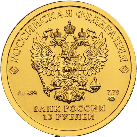На лицевой стороне монеты «Золотой червонец» расположено рельефное изображение Государственного герба Российской Федерации, имеются надписи: «РОССИЙСКАЯ ФЕДЕРАЦИЯ», «БАНК РОССИИ», номинал монеты: «10 РУБЛЕЙ», обозначение металла по Периодической системе элементов Д.И. Менделеева, проба, товарный знак монетного двора и масса драгоценного металла в чистоте.