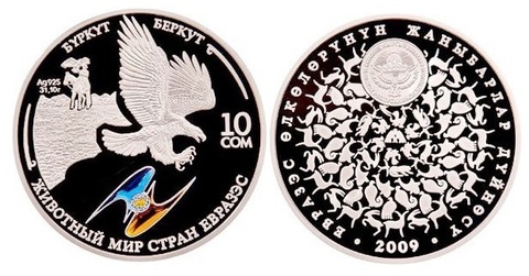 10 сом 2009 год. Киргизия. Беркут птица Животный мир стран ЕврАзЭС. Серебро