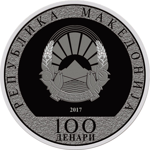 Аверс: В центре - рельефное изображение герба Республики Македонии. Вокруг надписи: РЕПУБЛИКА МАКЕДОНИJA (Республика Македония), год выпуска 2017 и номинал монеты 100 денари.